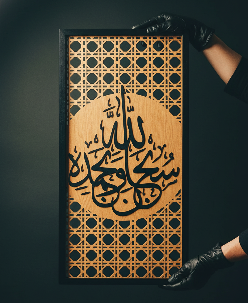 Made from natural plywood with a solid pinewood (Mousky) frame, each detail is laser-cut with precision to reveal the intricate geometric pattern surrounding the central calligraphic design — a timeless piece that brings warmth and elegance to any space.